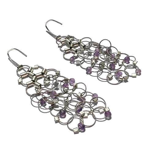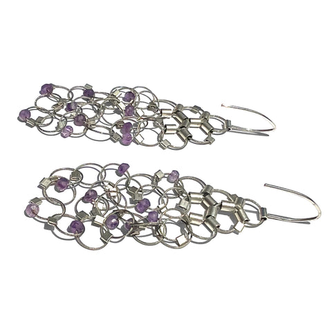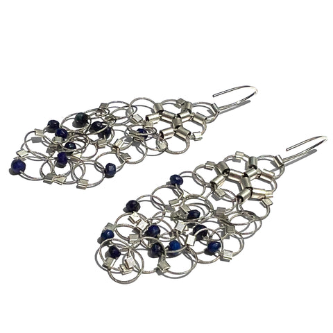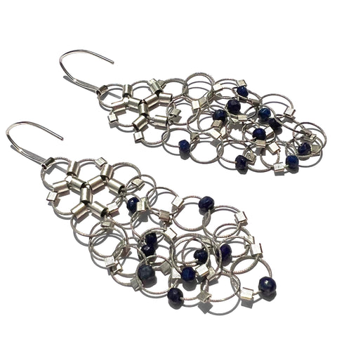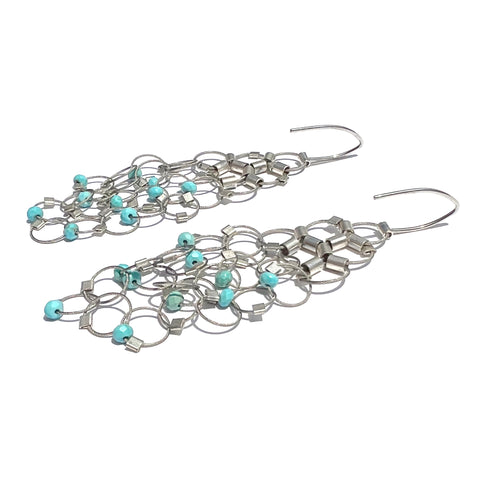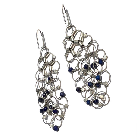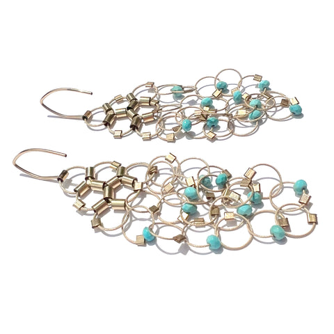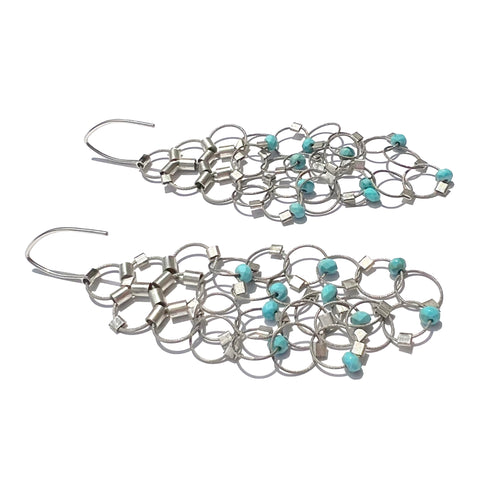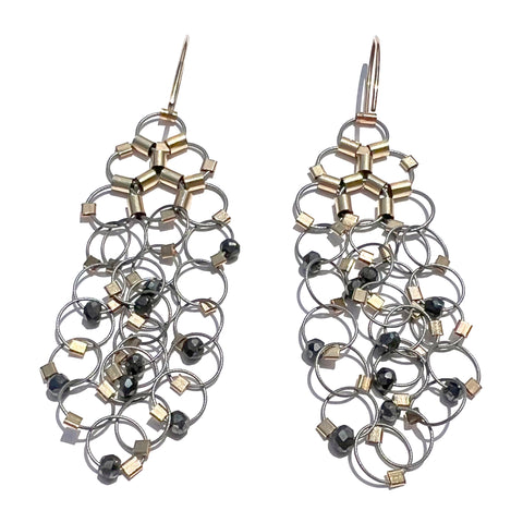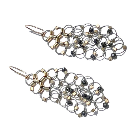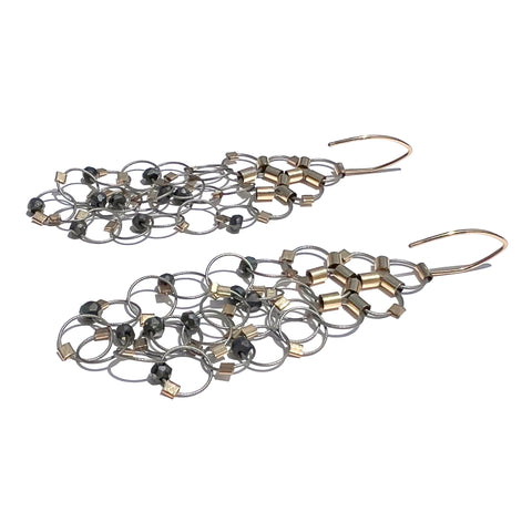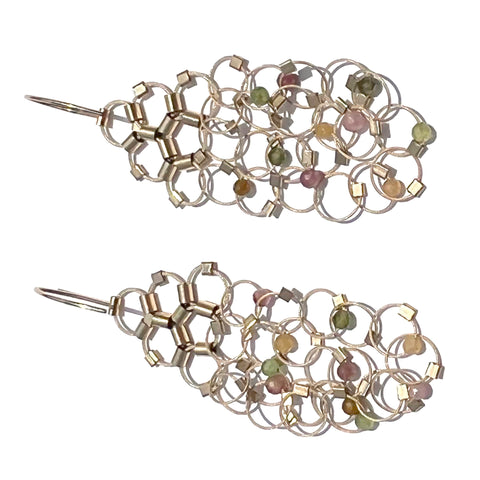 The Waterfall Earrings consist of an intricate web of links that flow into cascades of mini intertwining chains adorned with sparkling stones. More details about the materials: Flexible, light woven stainless steel mini cable finished with nylon for a smooth feel. Each piece is hand finished with little accents of sterling silver and/or 14k gold-fill as well as a choice of semi-precious stones.